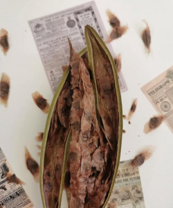 凌霄的果实为细长形蒴果,先端钝,成熟后裂开释放种子。果实长度约10-15厘米,种子呈扁平状,边缘有毛,颜色多为淡棕色或淡黄色。