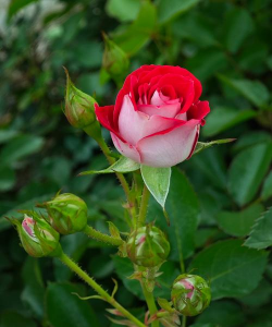 花色为红白复色,花瓣外层为鲜红色,中间花芯为乳白色,花朵大且艳丽,香气浓郁。