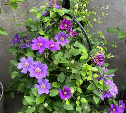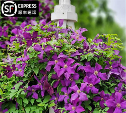 铁线莲(Clematis)部分品种如“杰克曼ii”(Clematis &x27;Jackmanii&x27;)开深紫色花朵,花形优雅。铁线莲适合垂直绿化,花期较长且抗病虫害能力强,需支撑结构辅助攀爬。