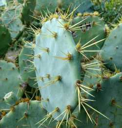仙人掌又肥又厚像一只布满细刺的大手。仙人掌是仙人掌科缩刺仙人掌的变种,原产西印度群岛、墨西哥、美国等,中国于明末引种,南方沿海地区常见栽培。仙人掌是丛生肉质灌木,高1.5-3米,叶钻形,绿色,早落;上部分枝宽倒卵形、倒卵状椭圆形或近圆形,绿色至蓝绿色;花托倒卵形,基部渐狭,绿色;花药黄色;浆果倒卵球形,顶端凹陷,表面平滑无毛,倒刺刚毛和钻形刺。种子多数扁圆形,淡黄褐色。
