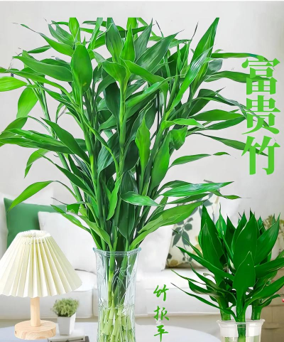 富贵竹为龙舌兰科、龙血树属植物,叶片呈长披针形,类似竹叶。富贵竹原产于加利群岛及非洲和亚洲热带地区,经引进,现中国多地均匀栽培。富贵竹喜阴凉,但需要适宜的光照,促进植株光合作用的进行,有利于植株生长发育。富贵竹多年常绿,观赏价值高。