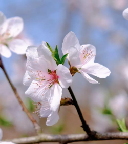 花:单生,先于叶开放,花瓣倒卵形或近圆形,粉红色或白色(如变种白花山桃),花期3-4月,是北方早春最早开花的木本植物之一。