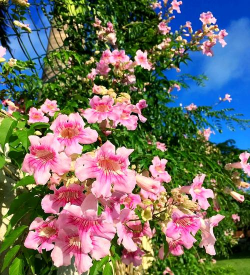 沙漠玫瑰原产近沙漠地区,耐旱耐热,枝干粗壮,花朵绚丽,盛夏为开花高峰期。