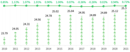 中国水稻种植面积约为3021.32万公倾,占粮食种植面积的27%,全国稻谷产量为20824.5万吨,其中杂交水稻的种植面积为1700万公顷。水稻是我国最主要的粮食作物之一,其播种面积、总产和单产都居粮食作物首位。我国水稻种植分为籼稻、粳稻,还有少量糯稻,其中早籼稻播种面积为8380万亩,中晚籼稻2.36亿亩,粳稻1.36亿亩。