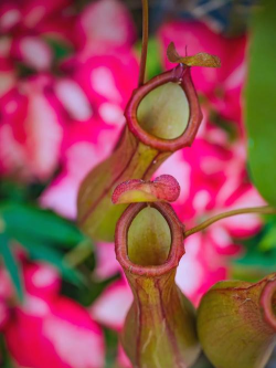 猪笼草是猪笼草科、猪笼草属植物、被子植物门,茎木质或半木质,差不多3米多高。花一般为总状花序,花小而平淡,白天味道淡,略香,晚上味道较浓烈,逐渐转臭。果为蒴果,成熟时开裂散出种子。猪笼草原产旧大陆热带地区,现广植东南亚一带。