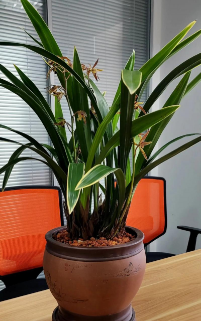 企黑墨兰:叶片直立宽大,墨绿色无斑纹,花淡雅,适合年宵花卉市场。