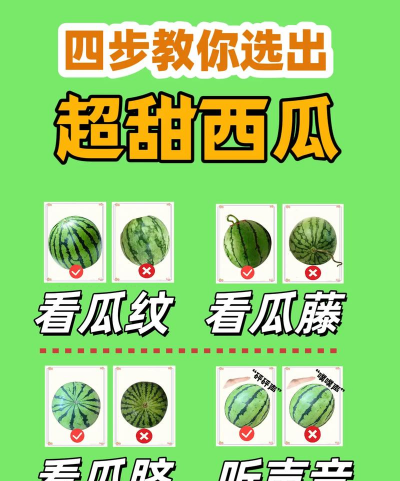 1、看瓜蒂:西瓜瓜蒂为新鲜绿色瓜不怎么熟,西瓜瓜蒂为干枯状的证明瓜已经熟了;2、拍打西瓜听声音:已经熟了的西瓜回声清脆,未成熟的西瓜回声沉闷;3、看瓜脐:与西瓜瓜蒂的对立面有一个类似于肚脐眼的瓜脐,瓜脐越小西瓜越甜,瓜脐越大西瓜越寡味;4、看瓜纹:瓜纹纹路越清晰的西瓜越甜。