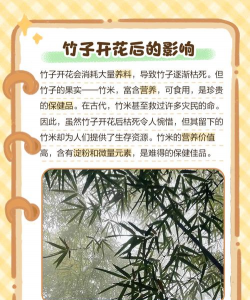 竹子开花是遗传程序与环境压力共同作用的结果,既有生物学必然性,也体现了植物适应环境的智慧。尽管其机制尚未完全破解,但人工管理(如施肥、砍伐老竹)可延缓开花,维持竹林健康。