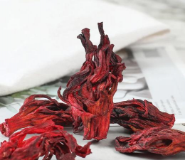 洛神花一般指玫瑰茄,本品略呈圆锥状或不规则形,长2.5~4cm,直径约2cm,花萼紫红色至紫黑色,5裂,裂片披针形,下部可见与花萼愈合的小苞片,约10裂,披针形,基部具有去除果实后留下的空洞。花冠黄棕色,外表面有线状条纹,内表面基部黄褐色,偶见稀疏的粗毛。