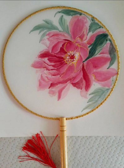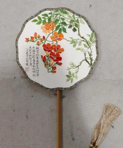牡丹 :象征富贵、华丽,常见于双面团扇、绢款宫扇等,如“落尽残红始吐芳,佳名唤作百花王”。