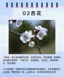杏花:白色花瓣,花萼深红色,枝条红褐色,花期较短(约10天)。