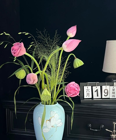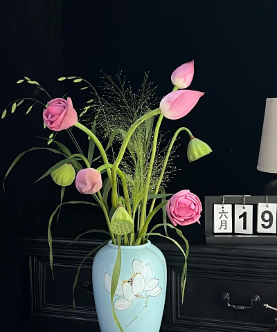 将荷花放入花瓶前,还需对花枝进行适当的修剪,可使用消毒后的锋利剪刀,将荷花枝条下端修剪成斜切口,以增加枝条的吸水面积。还需摘掉荷花花朵外层的花瓣,使荷花能够尽快开花。