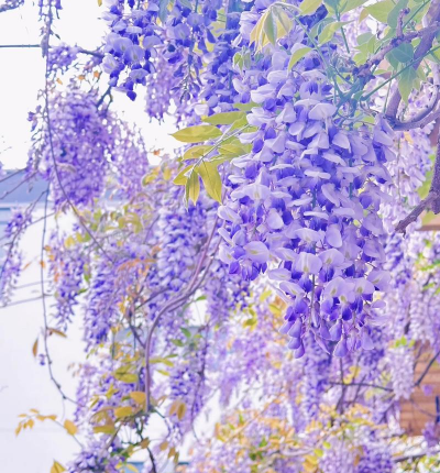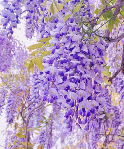 紫藤与樱花同为春季开花植物,粉色的樱花与紫色紫藤形成柔和的色彩过渡,共同营造梦幻的春日氛围。可让紫藤沿樱花树攀爬,形成立体景观。