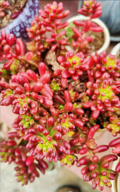 叶片小巧玲珑,呈长椭圆形或红色,可群生形成密集株型,适合盆栽或岩石园景观,增添室内生机。