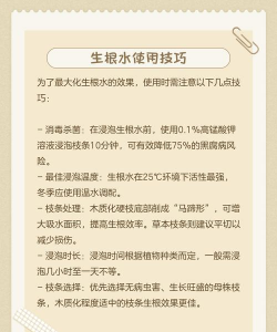 适用植物:木本花卉(如月季、三角梅)生根较慢,建议优先使用上述方法;肉质茎植物(如多肉)对生根水依赖较低。这些替代品均利用常见材料,经济实用且操作简单,适合家庭园艺使用。