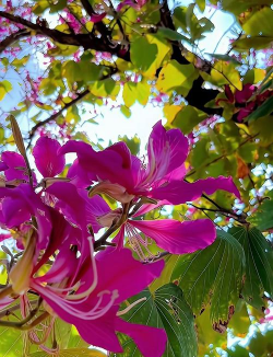 特点:香港的市花及特别行政区区花,花瓣呈深紫红色,花期从10月底持续至次年5月,盛花期在3-4月。叶子形似羊蹄,故得名“羊蹄甲”。
