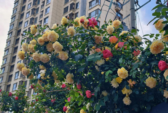 蔷薇(Rosa spp.)蔷薇带刺的藤蔓可形成“生态围墙”,兼具美观和防盗功能。花色多样,适合铁栅栏围栏。