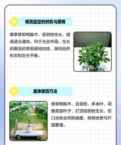 摘心打顶,当鸭脚木枝条生长至20厘米时,可修剪掉枝条的一部分,只保留三分之二的枝条;疏枝剪叶,在鸭脚木生长期间还需修剪掉发黄的枝叶,并对生长密集的枝叶进行疏剪;根部修剪,每次换盆时,需对鸭脚木的根系进行修剪,使鸭脚木更好的吸收水分和养分。修剪完成后需及时将鸭脚木转移到通风阴凉的环境下养护,使伤口能够尽快愈合。