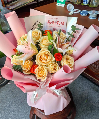 白兰花:代表敬意;麦杆花:寓意忠诚与感恩;金百合:象征品格欣赏与感谢。