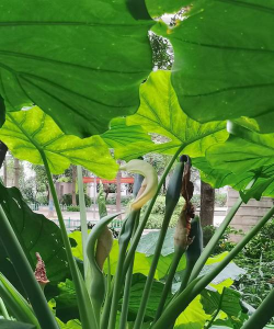 滴水观音属于天南星科、海芋属直立草本植物,植株高度为3米,茎干生长粗壮,表面总会分泌出粘液。叶片主要聚集生长在茎干的顶端,形状为卵状戟形,长度为30~90厘米,宽度为5~8厘米,叶柄的长度为1米。