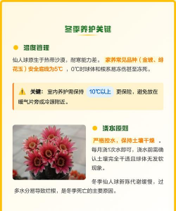 仙人球冬天怕冻,当温度低于5摄氏度的时候,会出现冻伤现象,当温度低于0摄氏度的时候,会出现冻死现象。冬季养殖仙人球时,需要移置到室内,温度控制在20摄氏度左右,不用施加肥料,等到土壤表面变干的时候就应该浇水。