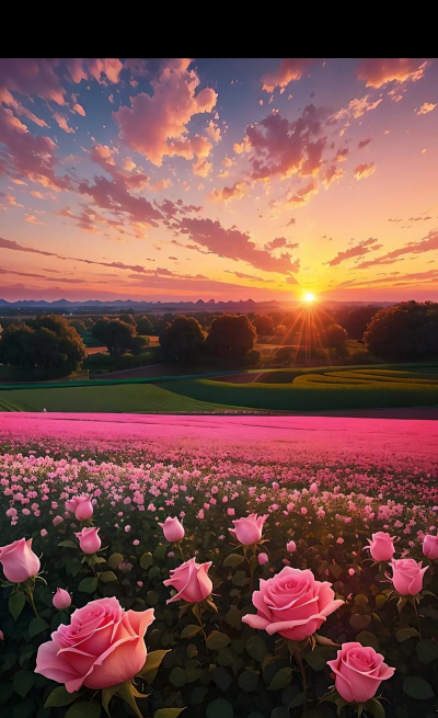特殊品种的玫瑰在夕阳映衬下呈现橙红色或粉色,象征爱情与希望。其花瓣边缘带有夕阳的金边,常用于婚礼或浪漫场景。