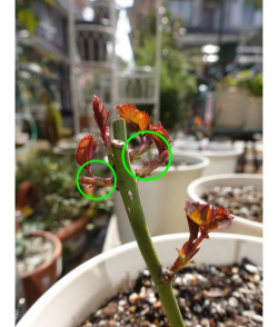 月季的分枝基部或老枝上可能存在“隐藏芽眼”,平时休眠,但在强剪或环境刺激(如压条)下可萌发,形成爆笋或新枝。