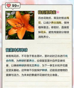 1、及时将百合花残花清理干净,这样既可提高植株枝叶间的空气流通度,亦可以帮植株减少水分流失;2、追施有机肥,施肥频率为一个月一次;3、浇水频率为一周一次,入冬之后可改为两周一次;4、开完花后的百合花可以先放在散光处养几天,之后再放于明亮通风处即可。