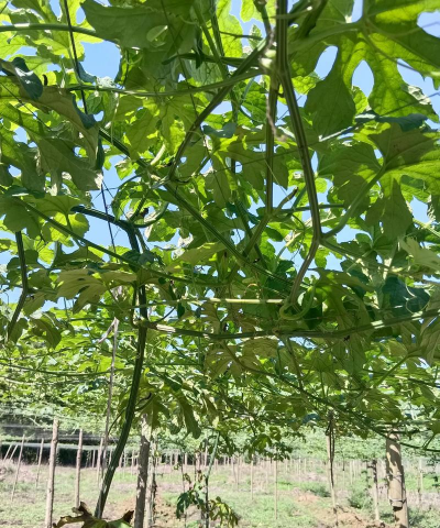 引蔓修剪:藤蔓长30-40厘米时用尼龙绳引蔓上架,主蔓长3米时打顶促侧枝;每株保留2-3根健壮蔓,及时摘除多余侧芽和9月后花蕾。