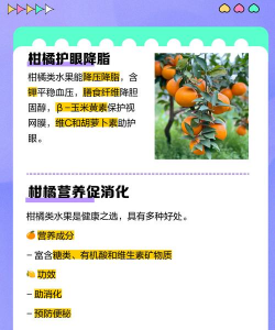 柑橘富含维生素C、柠檬酸、膳食纤维、钙、磷、铁等多种营养成分。其维生素C含量是苹果的7倍、梨的10倍,具有抗氧化、增强免疫力等作用。中医认为柑橘具有开胃理气、润肺止咳、化痰健脾等功效。此外,柑橘皮(陈皮)、橘络、橘核等均可入药,具有理气、化痰、散结等作用。