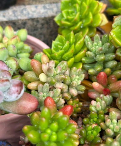 颜色:虹之玉的叶片会随着光照增强而整体变成红色,乙女心的叶片为绿色。高度:乙女心最高可达30厘米,虹之玉高度只有10厘米左右。叶片:乙女心叶片饱满,表面粗糙,而虹之玉叶片边缘具有棱角,表面富有光泽。