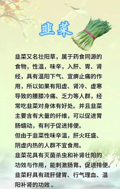 富含营养:韭菜含维生素C、维生素A、钙、铁及膳食纤维,有助于促进消化、预防便秘,被称为“洗肠草”。