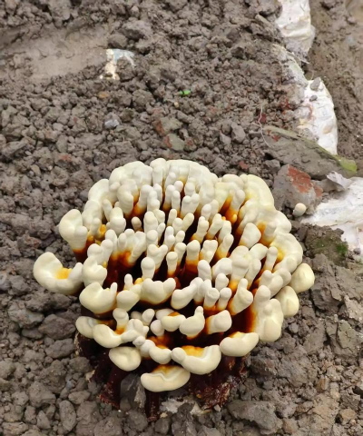 三周后,灵芝长开变成饼状,颜色淡黄,周围有白色。