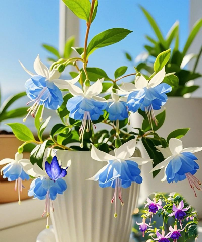 倒挂金钟(吊钟海棠)花型如彩色灯笼倒挂,花瓣覆瓦状排列,颜色多样(紫红、粉、白等),广泛栽培作盆栽观赏。