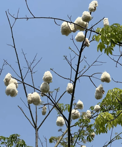 棉花糖或绒毛飞毯果期时,蒴果裂开释放白色棉絮状纤维,悬挂枝头如棉花团,种子借助绒毛随风飘散,宛如乘飞毯翱翔。这些比喻既体现了其形态的独特性,也融合了文化审美与生态适应性,使其成为园林景观中极具辨识度的树种。