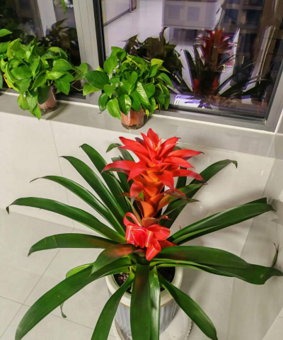 盆栽“鸿运当头”是一种凤梨科花卉,因其花芯鲜红、花序高耸如火焰,被赋予吉祥如意的象征意义。以下是其具体寓意及相关信息: