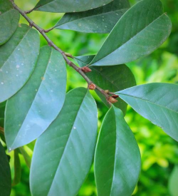 叶片呈狭长或倒卵形,边缘有短凸尖头,基部宽楔形或圆钝,整体油亮光滑。