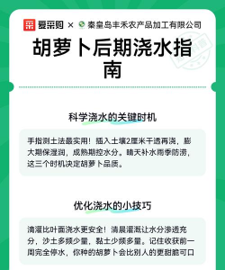 胡萝卜在浇水时需要注意的有出苗前的控水、幼苗期的浇水、膨大期的浇水和采收前控水等。出苗前保持土壤微湿即可,幼苗期小水勤浇见干见湿,膨大期浇足浇透,采收前10天停止浇水,注意适度适量少量多次的原则。