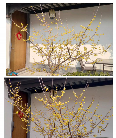 悬枝梅 :利用腊梅枝条自然下垂特性,搭配石头或绿植增强垂感。