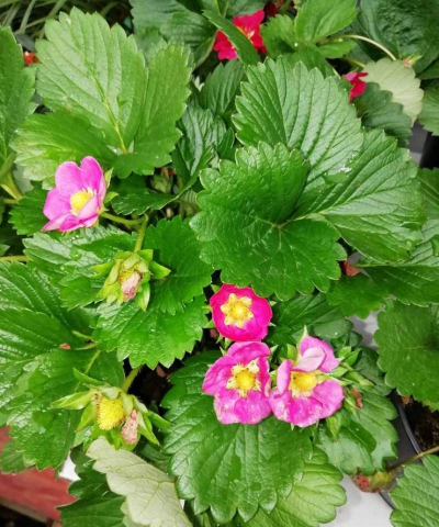 特点:红花草莓是通过草莓与开红花的委陵菜远缘杂交培育的,花朵呈深玫红色或粉红色,花径可达5厘米,花期长(晚春至霜降),兼具观赏与食用价值。例如品种‘托斯卡纳’(Toscana)曾获欧洲花卉之星奖,其玫红色花朵密集开放,搭配红色果实,视觉效果类似红草莓。