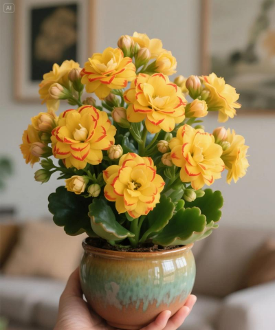 特点:花朵直径可达3厘米,完全重瓣,花瓣层叠如牡丹,初开白色,晒后渐变为粉色,带有喷砂质感。花量大,花期从11月持续至次年春末,被誉为“长寿花界的贵族”。