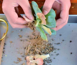 轻轻取出多肉,抖落或刷掉大部分旧土,顽固土块可浸泡软化后清理,避免损伤根系。