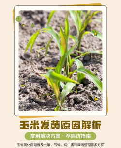 玉米苗的叶子发黄,可能是养分不足导致的。如果养护不当,导致玉米苗滋生了病虫害,那么它的叶子也会发黄,还有可能是种植过深和种植密度过高导致的。注意水分不足和水分过多的情况下,玉米苗叶子也会发黄。