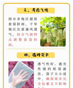 1、套袋时间 葡萄套袋要在疏果后进行,也就是果实表面带有白霜时,即可对其套袋。但套袋不能在高温天气或者阳光过于强烈时进行,以免葡萄无法适应套袋的环境,出现腐烂的现象。