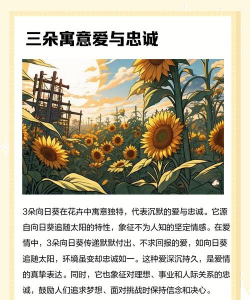 3朵向日葵代表着沉默的爱和爱慕,可以用来送给暗恋的人,表达了自己浓烈的爱意。除了表达爱意之外,向日葵还可以代表信念、坚强、高傲、忠诚等含义。向日葵花色鲜艳,向着阳光生长,是坚强无畏的体现。