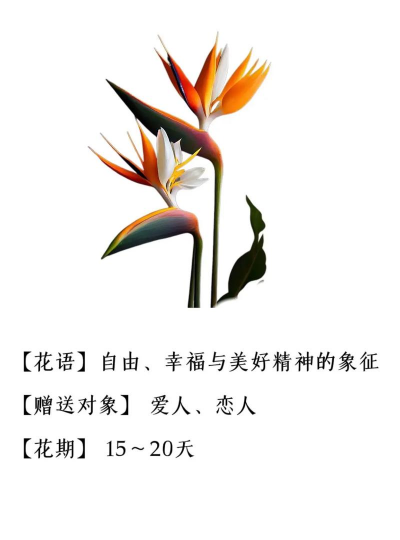 天堂鸟的花语是天堂鸟的花语是无拘无束、自由、长久的思念、长寿健康、为恋爱打扮的男孩子等,常用来表达“爱你义无反顾”,寓意百年好合。天堂鸟花又叫极乐鸟之花,鹤望兰,它是自由、幸福、潇洒、吉祥、思念的象征,表达对亲人的思念和对美好感情的追求。