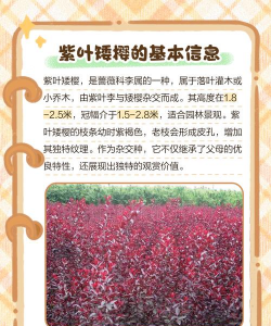 紫叶矮樱高1.8米至2.5米,冠幅1.5米至2.8米,枝条幼时紫褐色,老枝有皮孔。花单生,淡粉红色,花瓣5片,微香,花期4~5月。紫叶矮樱是紫叶李和矮樱的杂交种。各地均有栽培,我国华北、华中、华东、华南等地均适宜栽培,东北的辽宁、吉林南部等冬季可以安全越冬。紫叶矮樱色感效果好。紫叶矮樱在整个生长季节内其叶片呈紫红色,亮丽别致,树形紧凑,叶片稠密,整株色感表现好。在盆栽应用方面,可制成中型和微型盆景。