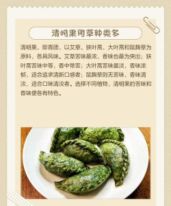 清明果可以做的草有绥草、清明草、大麦草、鼠曲草、泥胡菜、艾草。绥草的花期是在4月清明节前夕,绥草做的清明果也是相当好吃的。采摘清明草来做清明果也是非常方便的,将清明草的汁水倒入到糯米当中,再把它揉匀,就可以做清明果了。新鲜的大麦草捣出来的汁特别的青绿,大麦草来制作清明果,是在江苏地区比较多的一种方法。