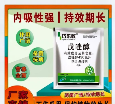 戊唑醇是一种三唑类的广谱剂,具有效果好、药效时间长等诸多优点。它可以用于小麦散黑穗病、玉米丝黑穗病、高粱丝黑穗病、油菜菌核病,还可以用于禾谷类作物的锈病、根腐病、白粉病、赤霉病以及园林植物的叶斑病、黑斑病、叶枯病、炭疽病等疾病。