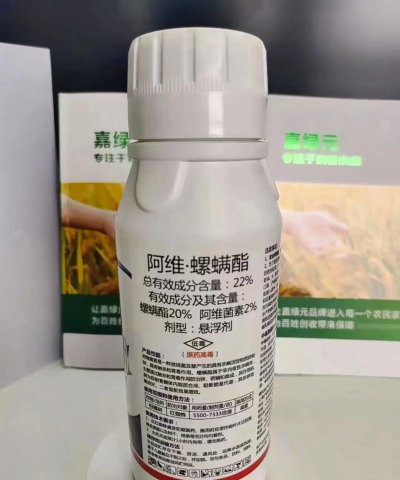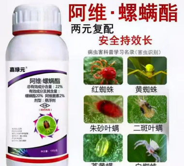 阿维螺螨酯是阿维菌素和螺螨酯复配的一种杀虫剂,阿维菌素有触杀和胃毒作用,螺螨酯能抑制害螨体内脂质合成、阻断能量代谢,对卵、若螨、成螨效果较好。春季叶子上的黄蜘蛛、红蜘蛛的虫卵数量达到了10粒/叶或者若虫数量达到了3-4头/叶时,使用100ml的34%螺螨酯悬浮剂兑水400-500kg后喷雾防治。